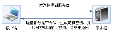 第二步:客戶端發(fā)送用戶帳號到服務器,服務器根據(jù)帳號執(zhí)行數(shù)據(jù)庫查詢并驗證合法性,帳號合法則產生一個隨機密鑰Key,并用帳號密碼MD5加密此密鑰Key,一并返回給客戶端,同時保存此Key;
